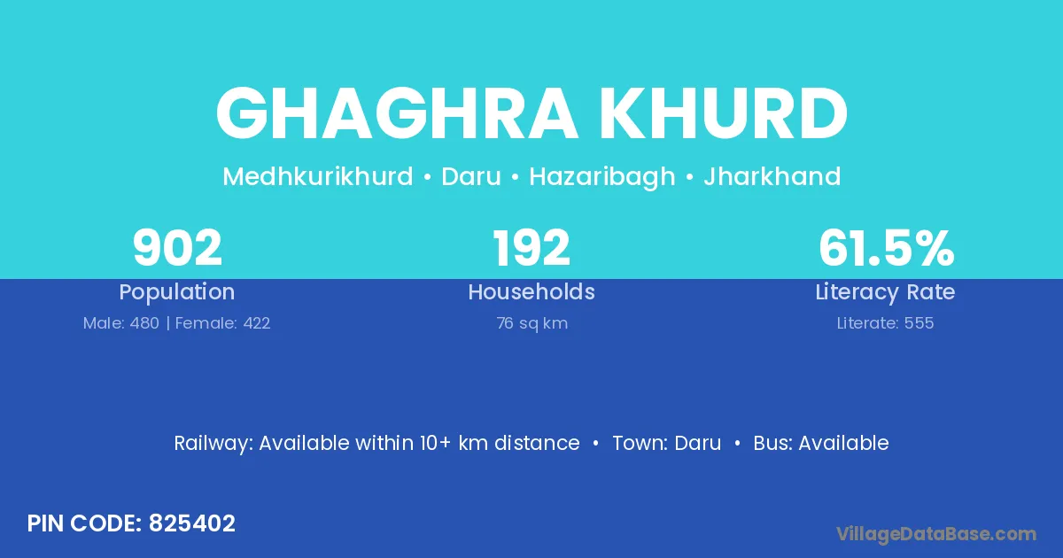 Ghaghra Khurd village has a total population of 902 people, of which 480 are males and 422 are females.