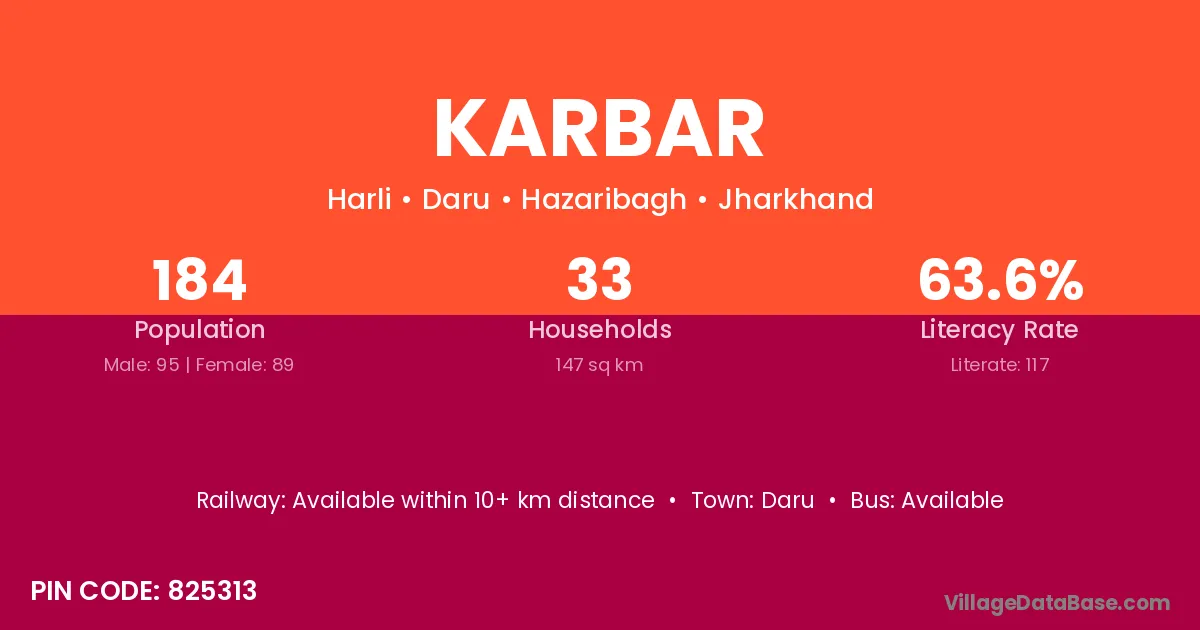 Karbar village has a total population of 184 people, of which 95 are males and 89 are females.