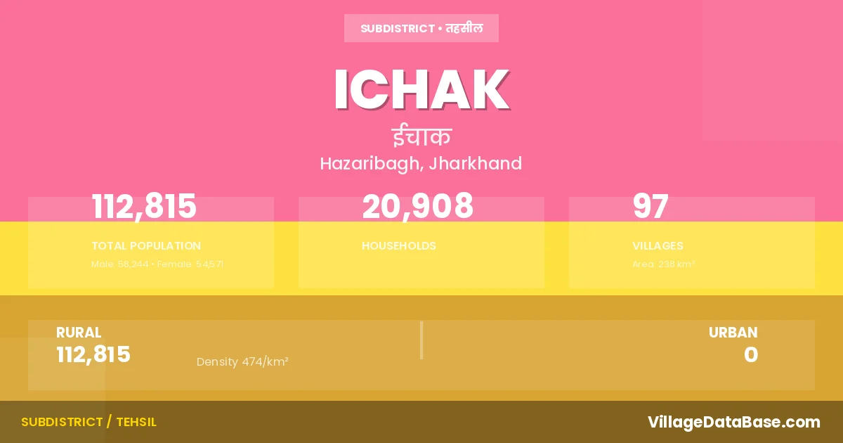 Ichak is a town and Subdivision in the Hazaribagh district of the Jharkhand. In India, a Subdivision is a subdivision of a district responsible for the administration and revenue collection of a specific area within the district. Subdivisions play a crucial role in the local governance structure, contributing significantly to the development and administration of their communities.