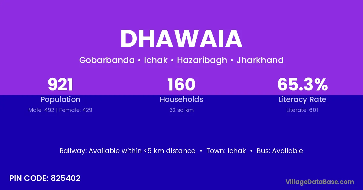 Dhawaia village has a total population of 921 people, of which 492 are males and 429 are females.