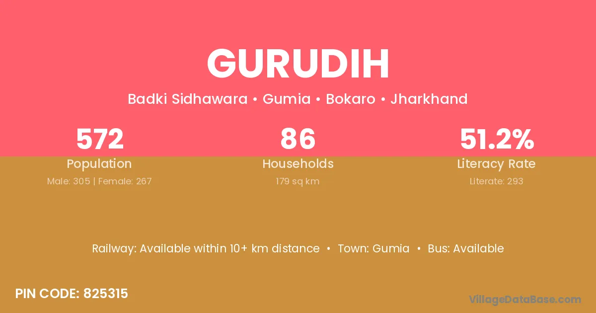 The literacy rate of Gurudih village is 52.35%. Male literacy stands at 60.00% and female literacy at 43.75%.
