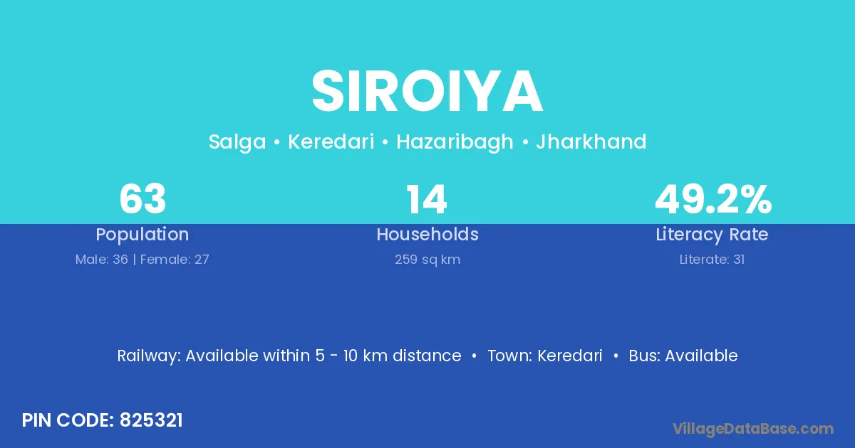 Siroiya village has a total population of 63 people, of which 36 are males and 27 are females.