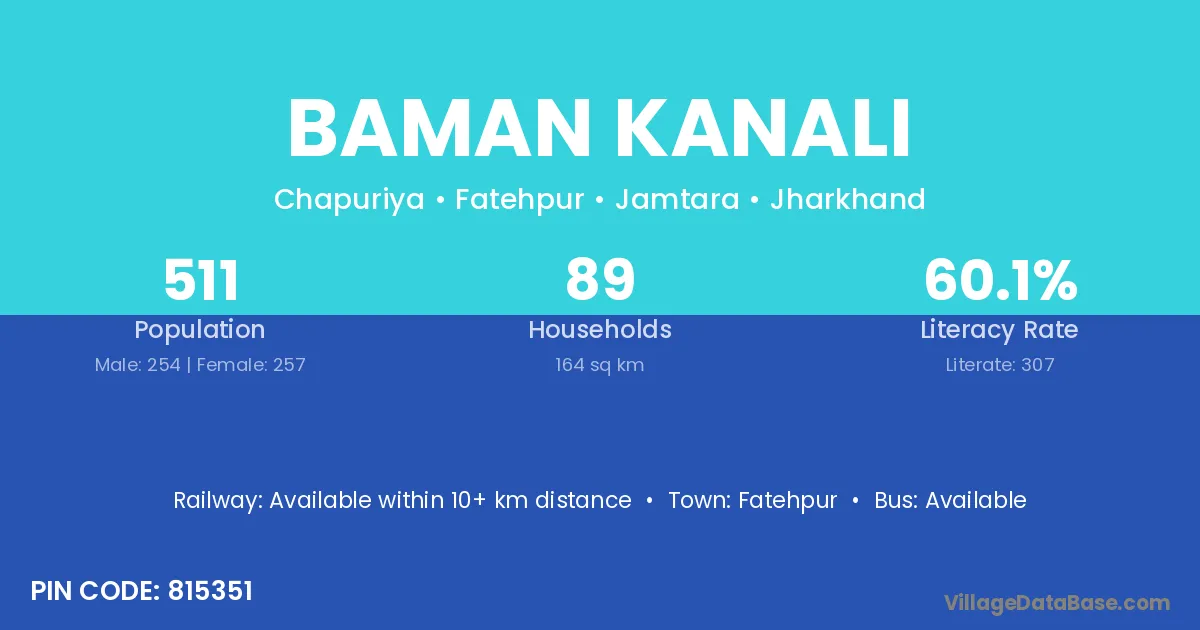 Baman Kanali village has a total population of 511 people, of which 254 are males and 257 are females.