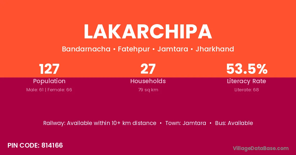 Lakarchipa village has a total population of 127 people, of which 61 are males and 66 are females.