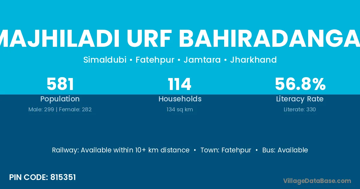 Majhiladi Urf Bahiradangal village has a total population of 581 people, of which 299 are males and 282 are females.