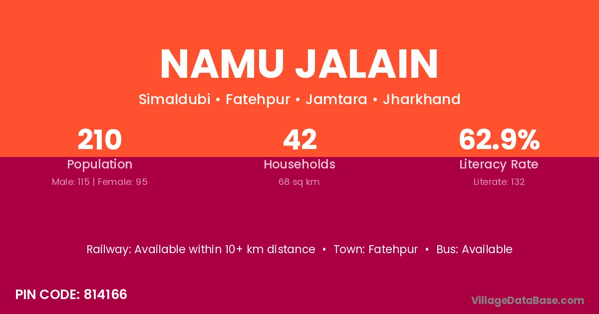 Namu Jalain village has a total population of 210 people, of which 115 are males and 95 are females.