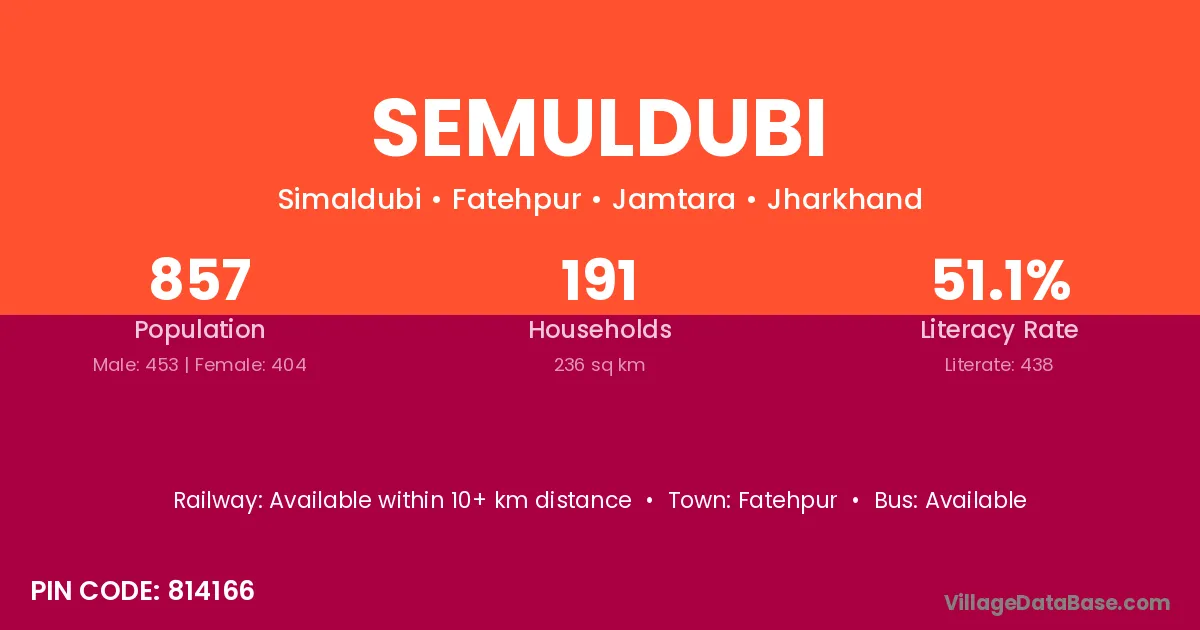 Semuldubi village has a total population of 857 people, of which 453 are males and 404 are females.