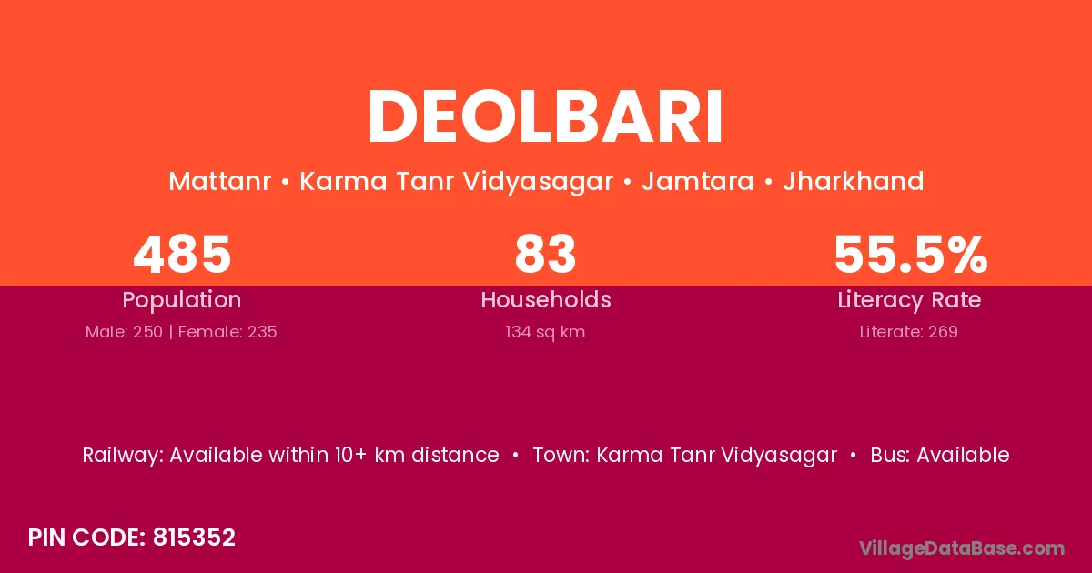 Deolbari village has a total population of 485 people, of which 250 are males and 235 are females.