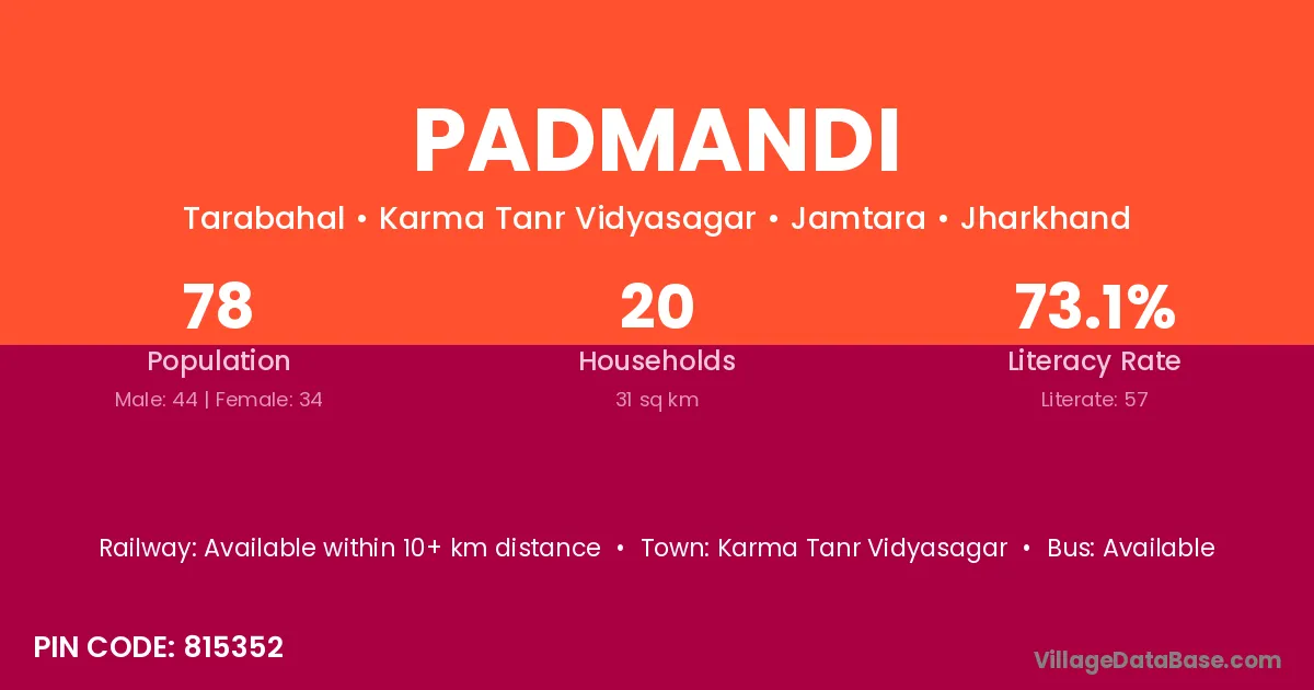 Padmandi village has a total population of 78 people, of which 44 are males and 34 are females.