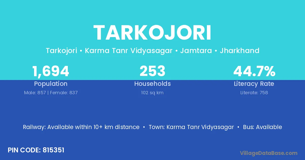 The literacy rate of Tarkojori village is 44.75%. Male literacy stands at 52.74% and female literacy at 36.56%.