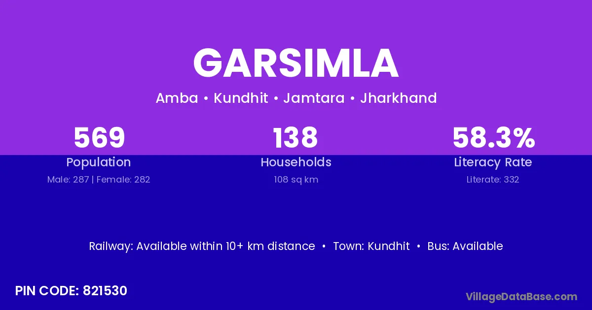 Garsimla village has a total population of 569 people, of which 287 are males and 282 are females.