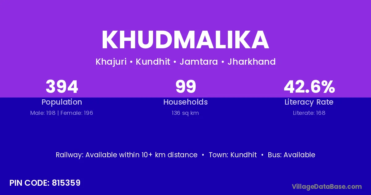 Khudmalika village has a total population of 394 people, of which 198 are males and 196 are females.