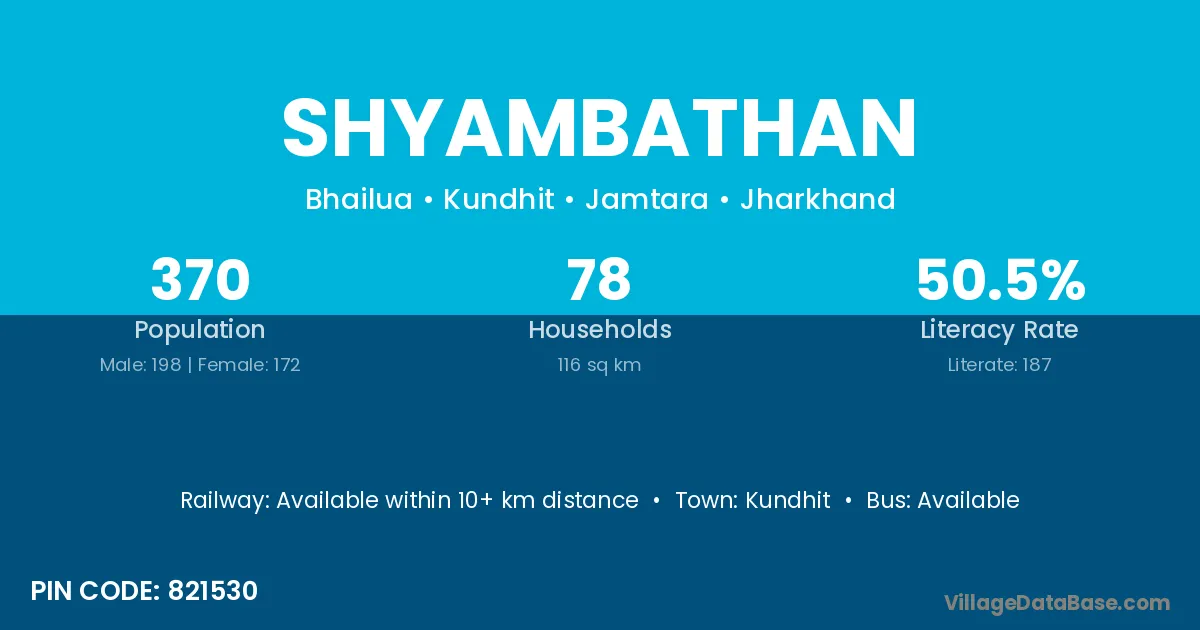 Shyambathan village has a total population of 370 people, of which 198 are males and 172 are females.