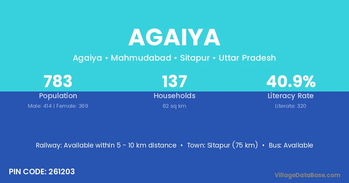 Agaiya village has a total population of 340 people, of which 170 are males and 170 are females.