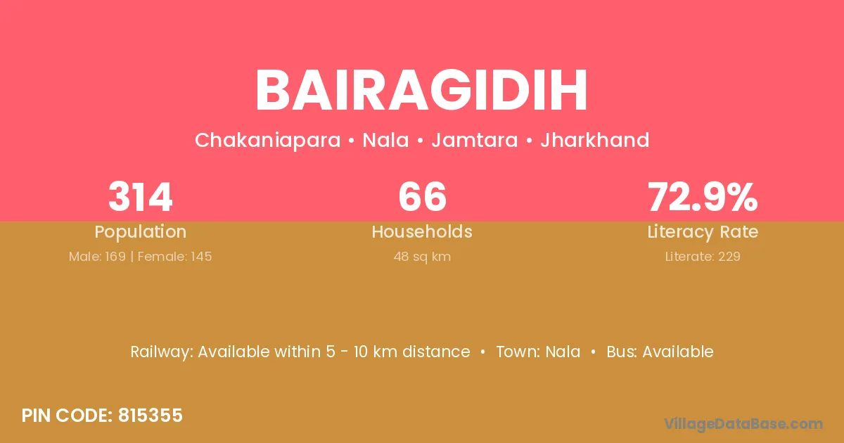 Bairagidih village has a total population of 314 people, of which 169 are males and 145 are females.