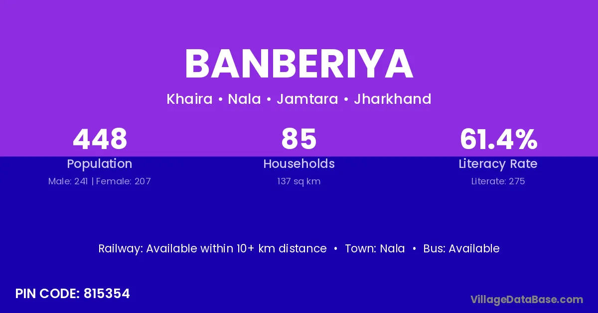 Banberiya village has a total population of 448 people, of which 241 are males and 207 are females.