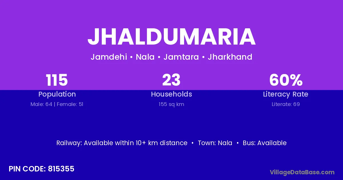 Jhaldumaria village has a total population of 115 people, of which 64 are males and 51 are females.