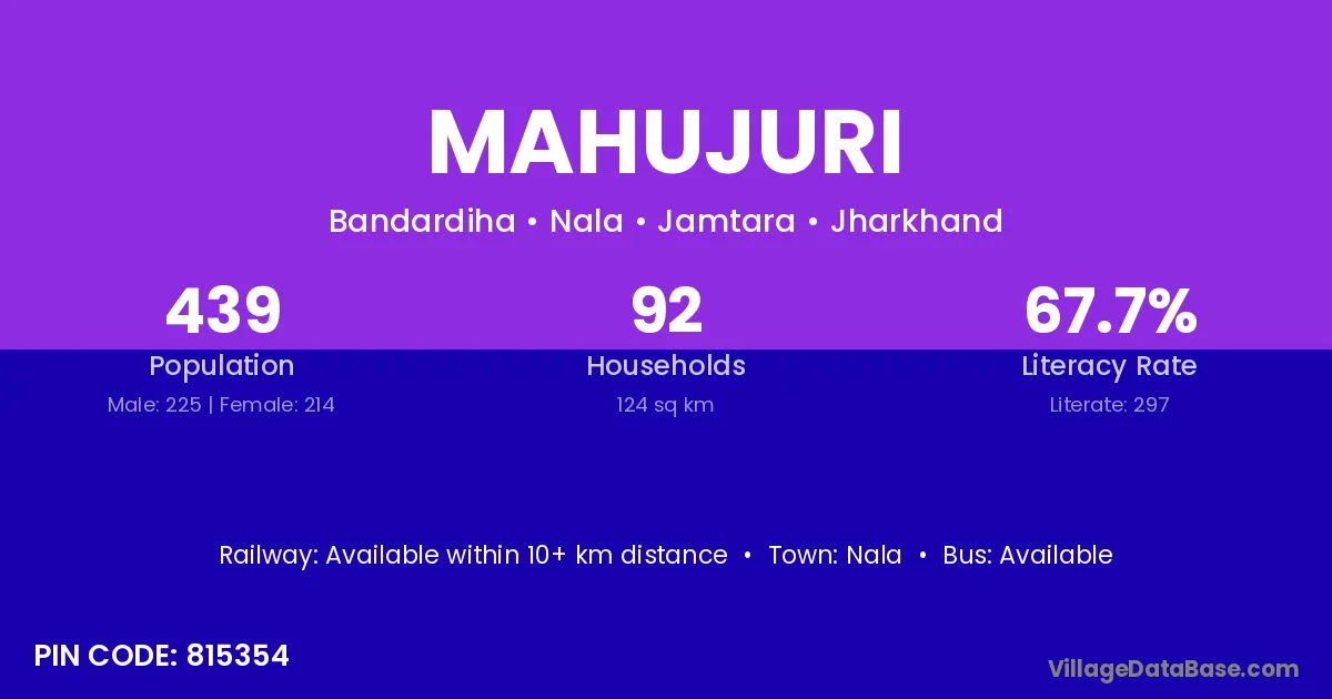 Mahujuri village has a total population of 439 people, of which 225 are males and 214 are females.