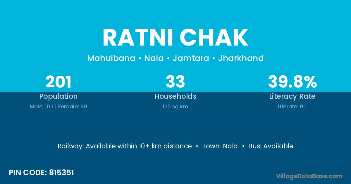 Ratni Chak village has a total population of 201 people, of which 103 are males and 98 are females.