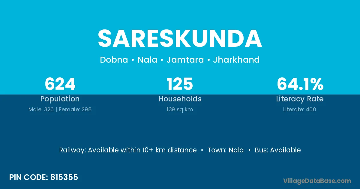 Sareskunda village has a total population of 624 people, of which 326 are males and 298 are females.