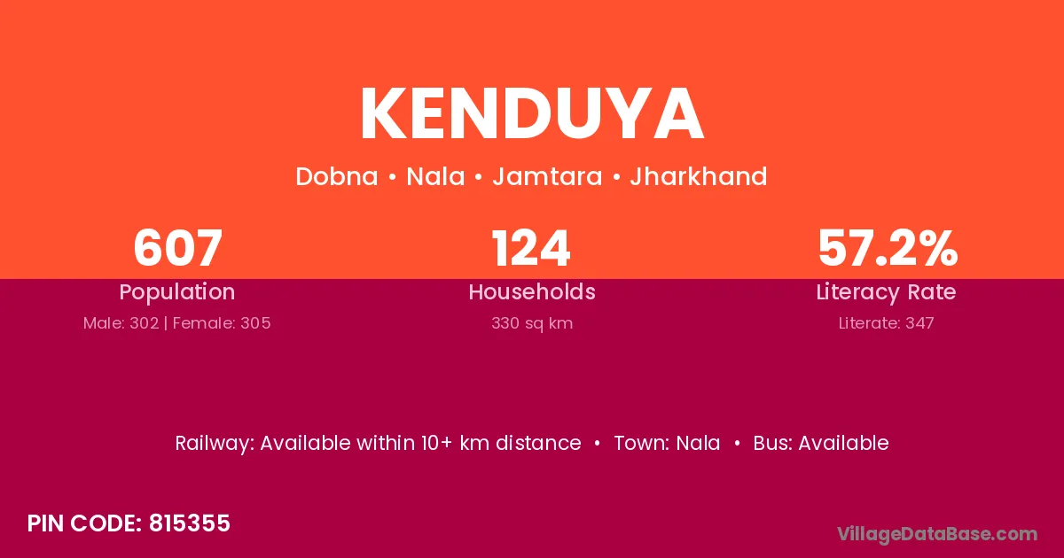 Kenduya village has a total population of 1,855 people, of which 974 are males and 881 are females.