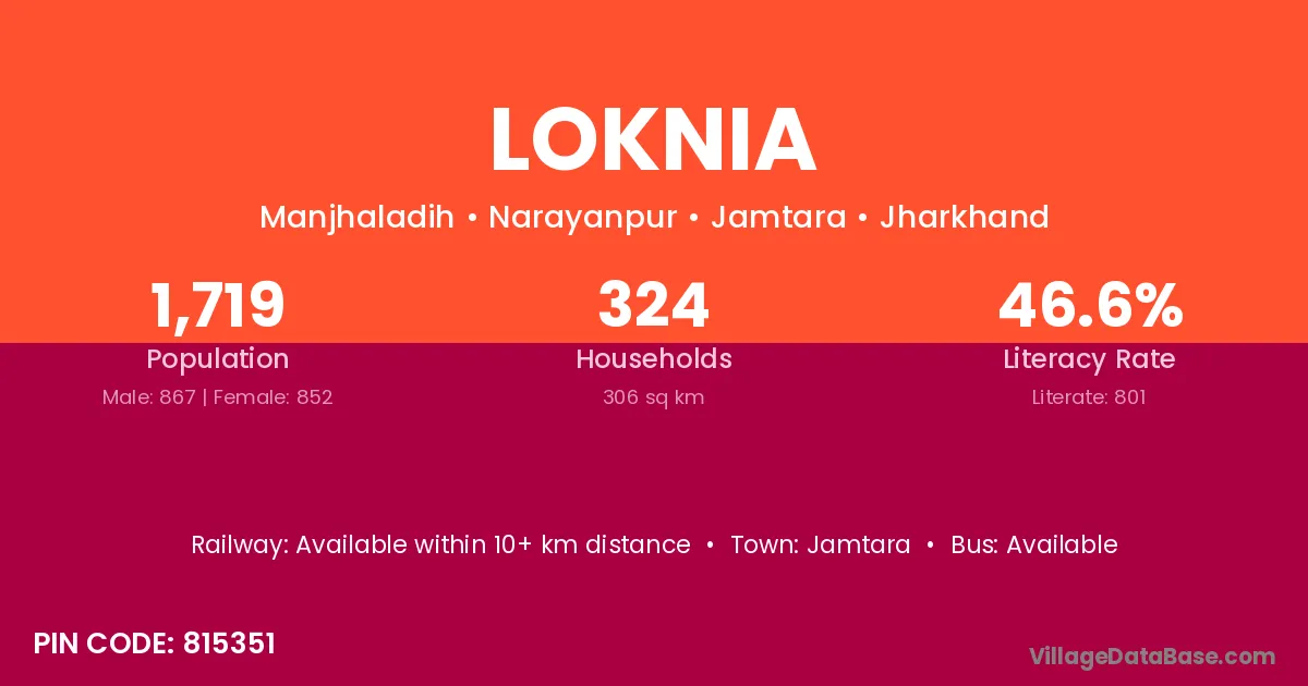 Loknia village is located in the Narayanpur Subdivision of the Jamtara district in Jharkhand .