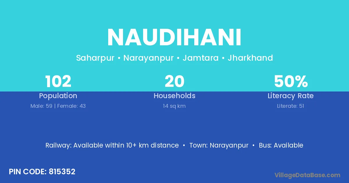 Naudihani village has a total population of 102 people, of which 59 are males and 43 are females.