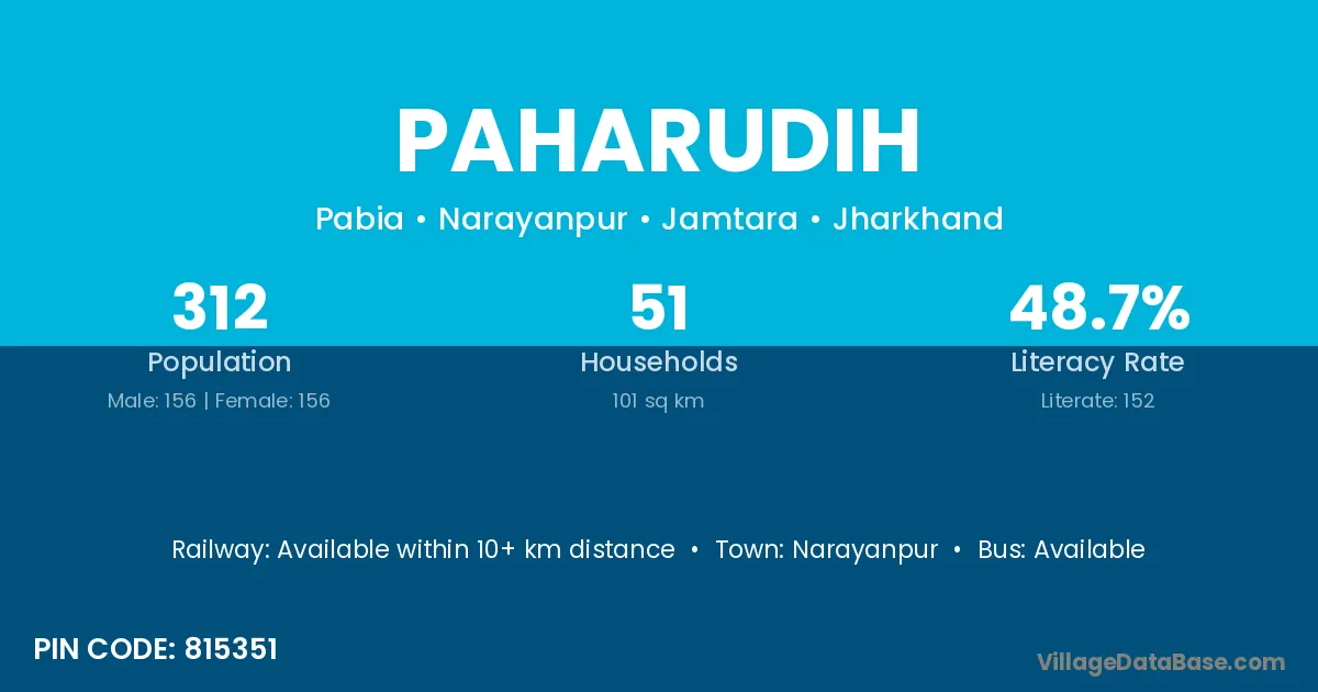 Paharudih village has a total population of 312 people, of which 156 are males and 156 are females.