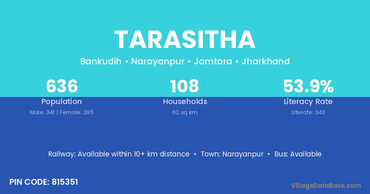 The literacy rate of Tarasitha village is 53.93%. Male literacy stands at 58.65% and female literacy at 48.47%.