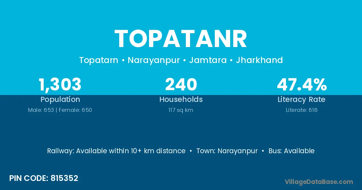 Topatanr village has a total population of 1,303 people, of which 653 are males and 650 are females.