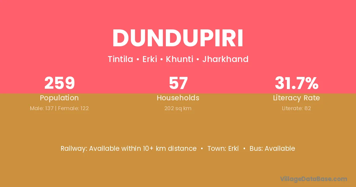 Dundupiri village is located in the Erki Subdivision of the Khunti district in Jharkhand .