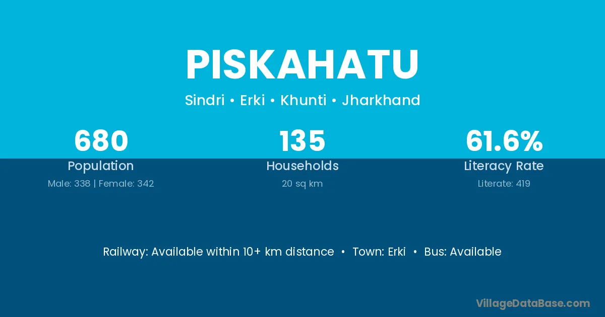The literacy rate of Piskahatu village is 61.62%. Male literacy stands at 76.04% and female literacy at 47.37%.