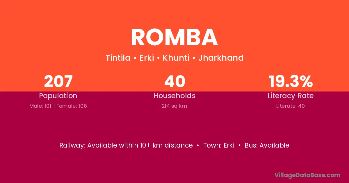The literacy rate of Romba village is 19.32%. Male literacy stands at 32.67% and female literacy at 6.60%.