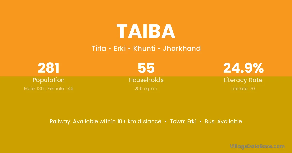 The literacy rate of Taiba village is 24.91%. Male literacy stands at 41.48% and female literacy at 9.59%.