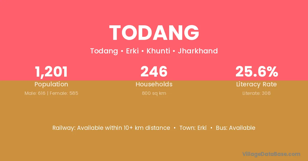 Todang village has a total population of 1,201 people, of which 616 are males and 585 are females.