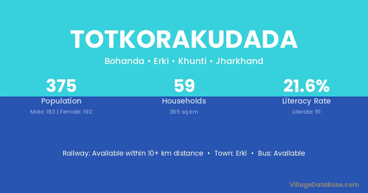 Totkorakudada village has a total population of 375 people, of which 183 are males and 192 are females.