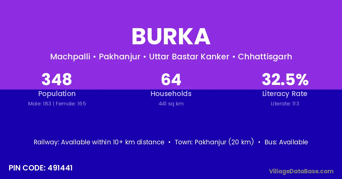 The literacy rate of Burka village is 50.89%. Male literacy stands at 59.85% and female literacy at 42.36%.