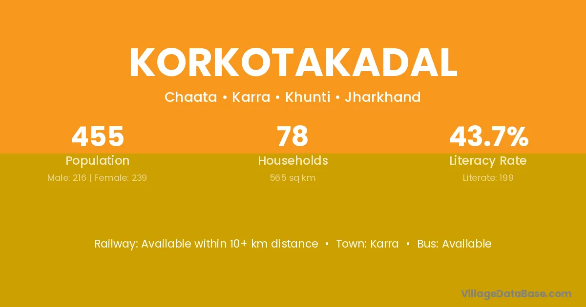 Korkotakadal village has a total population of 455 people, of which 216 are males and 239 are females.