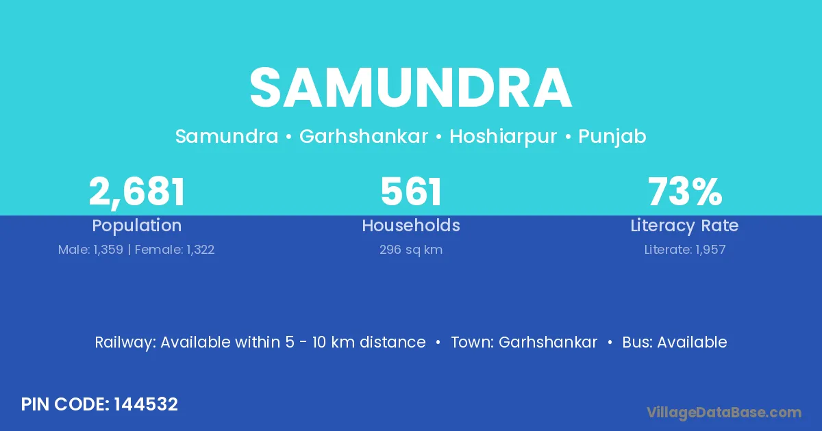 The literacy rate of Samundra village is 38.20%. Male literacy stands at 44.48% and female literacy at 32.41%.