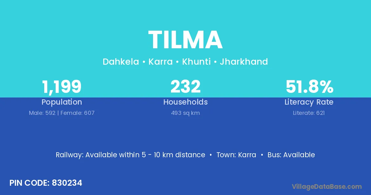 Tilma village has a total population of 1,199 people, of which 592 are males and 607 are females.