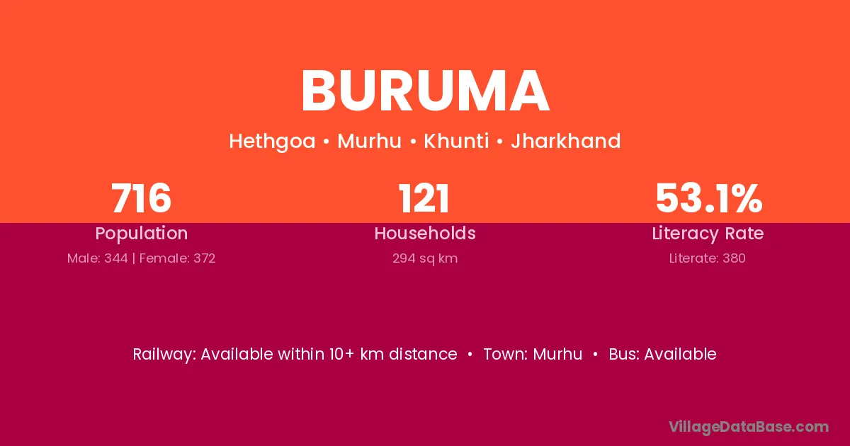 Buruma village has a total population of 716 people, of which 344 are males and 372 are females.
