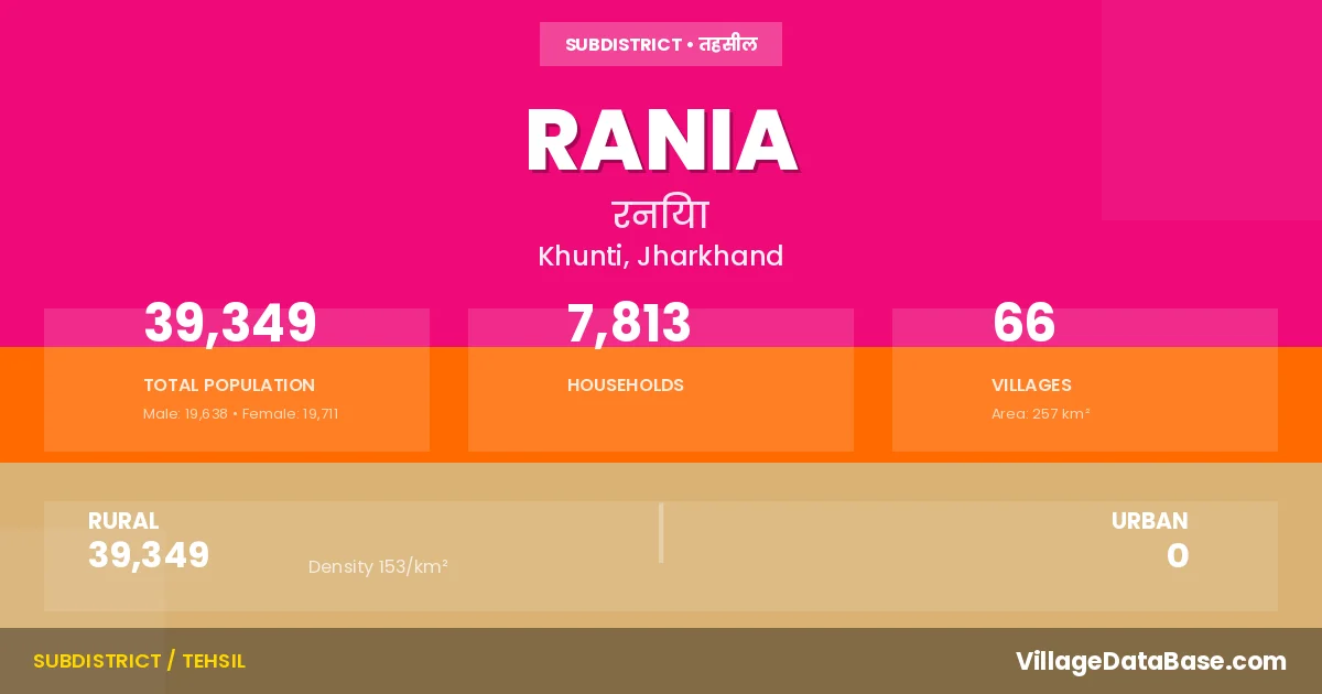 Rania is a town and Subdivision in the Khunti district of the Jharkhand. In India, a Subdivision is a subdivision of a district responsible for the administration and revenue collection of a specific area within the district. Subdivisions play a crucial role in the local governance structure, contributing significantly to the development and administration of their communities.