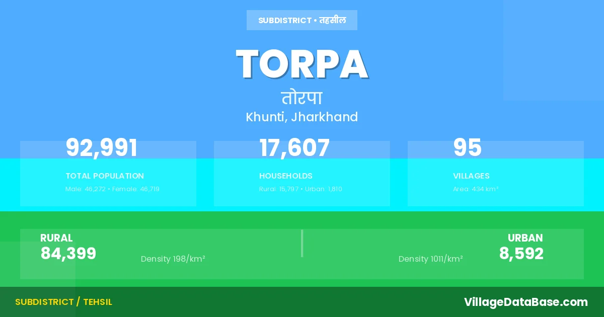According to the 2011 census The total area of Torpa Subdivision is 434 km², with a population of 92991 people. The population density is 214 inhabitants per square kilometre, and there are approximately 17607 houses in the sub district.