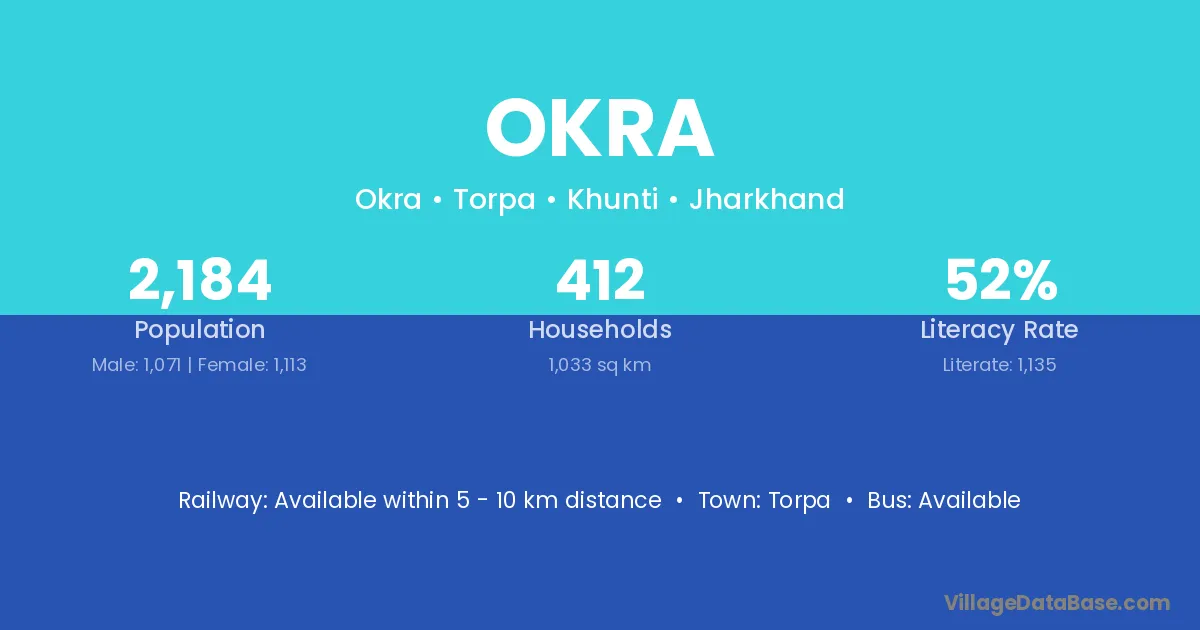 Okra village has a total population of 2,184 people, of which 1,071 are males and 1,113 are females.