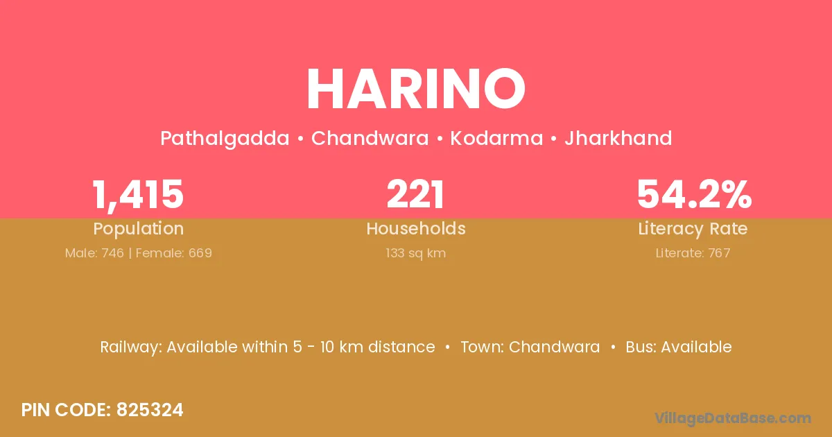 The literacy rate of Harino village is 54.20%. Male literacy stands at 66.09% and female literacy at 40.96%.