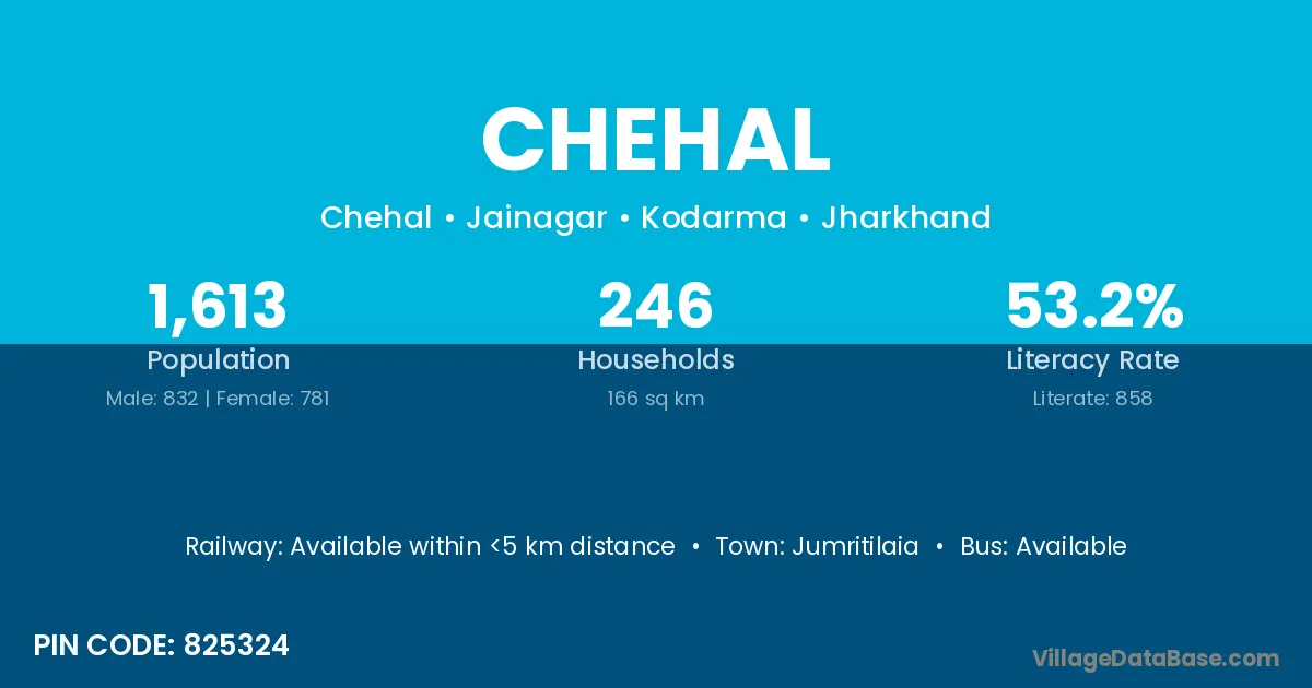 Chehal village has a total population of 1,613 people, of which 832 are males and 781 are females.