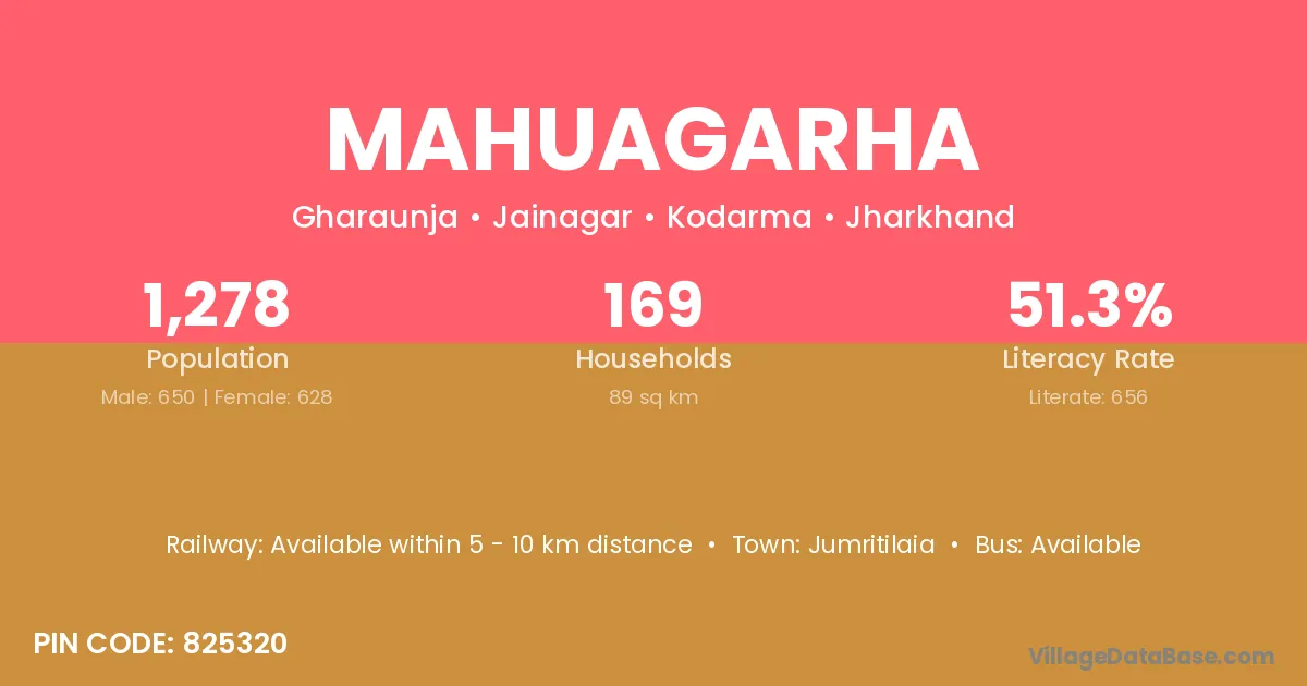 Mahuagarha village has a total population of 1,278 people, of which 650 are males and 628 are females.