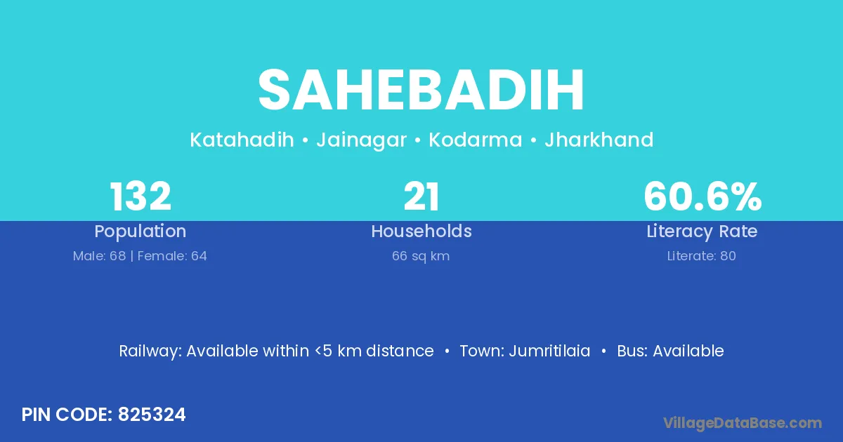 Sahebadih village has a total population of 132 people, of which 68 are males and 64 are females.