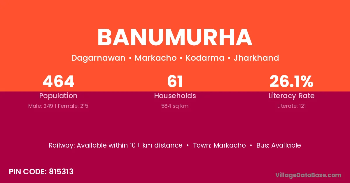 Banumurha village has a total population of 464 people, of which 249 are males and 215 are females.