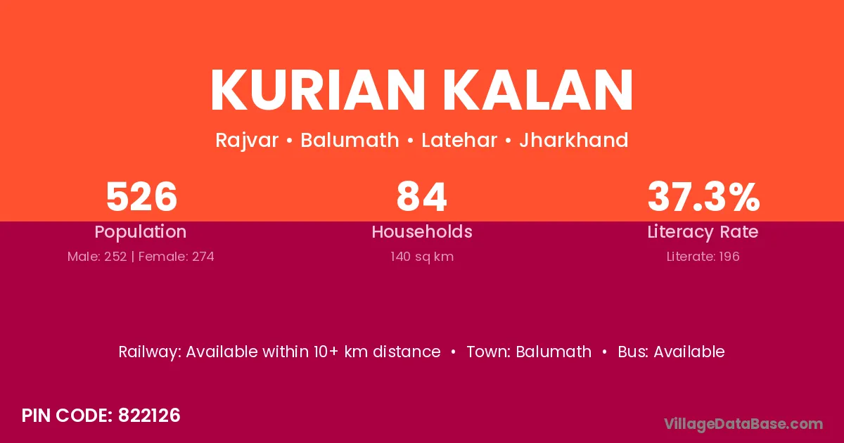 Kurian Kalan village has a total population of 526 people, of which 252 are males and 274 are females.